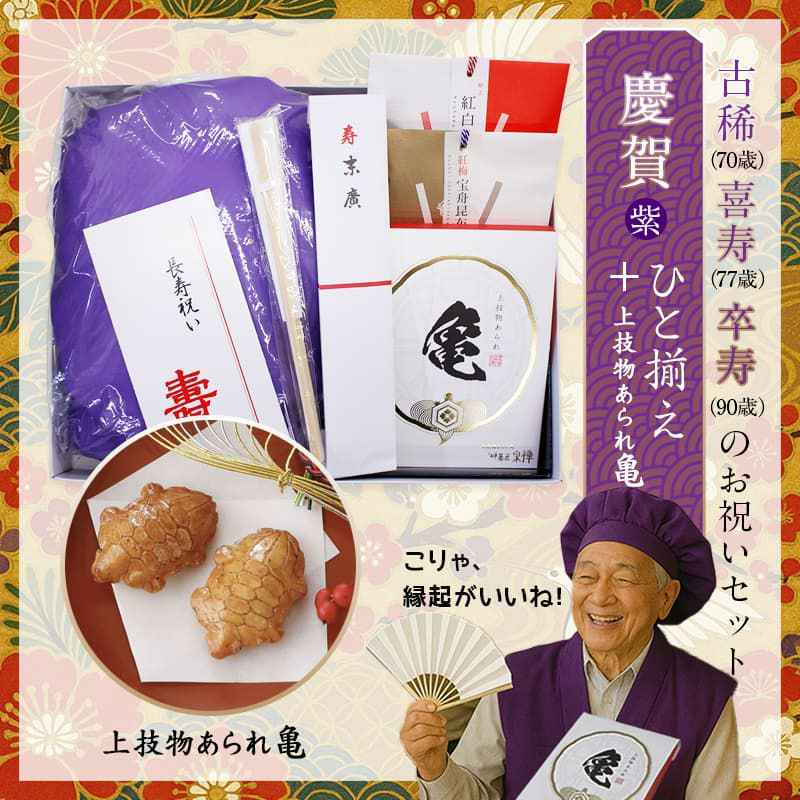 賀寿は長寿をお祝いする日本の伝統的行事です。年齢に応じて祝い色があり、 還暦(60歳)=赤、古希(70歳)・喜寿(77歳)=紫、傘寿(80歳)・米寿(88歳)=黄など、 さらなる健康と長寿の願いを人生を象徴する色と縁起物にこめて、家族のきずなをさらに深めるおめでたい習わしです。