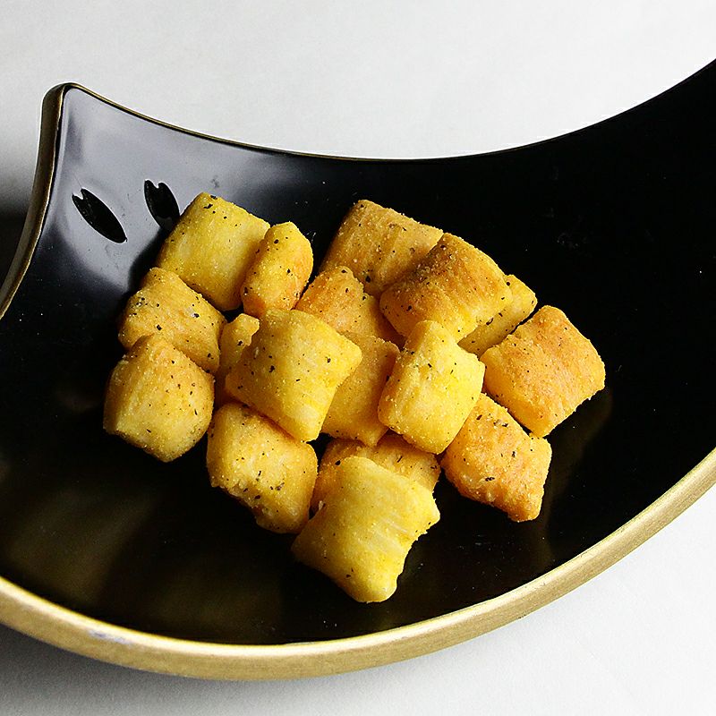 海の香りがする挑戦的なあられ。イカスミの香りと味わいにオリーブオイルと隠し味の黒こしょうと一味がピリッと効いた逸品です。