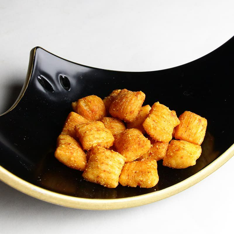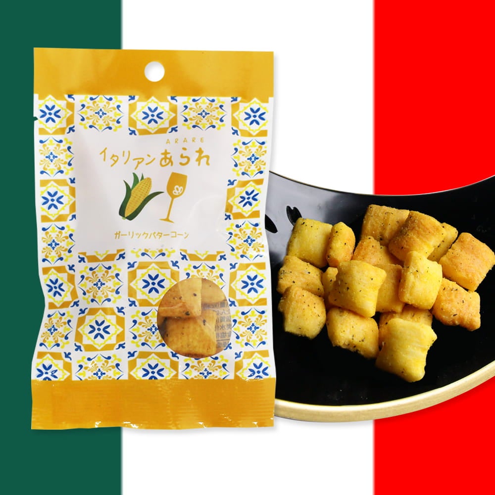 食欲をそそるガーリックとバターの香り、噛みしめるごとに増すガーリックの味わいと、とうもろこしのほのかな甘さが絶品の欧風あられです。