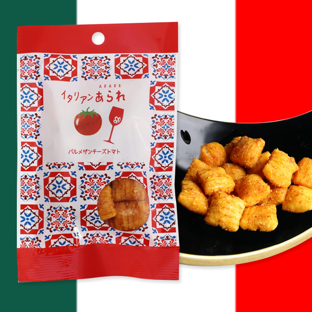 イカスミ・チーズ・トマト・バジル・ガーリック・・・。あられとしては珍しいイタリアンテイストの食材を厳選使用した、香りも味も十分に楽しめる和洋織り成すあられです。ワインやビールはもちろん、珈琲や紅茶、緑茶などのお茶うけとしてもお楽しみいただけますので、ぜひ一度ご賞味下さいませ。
