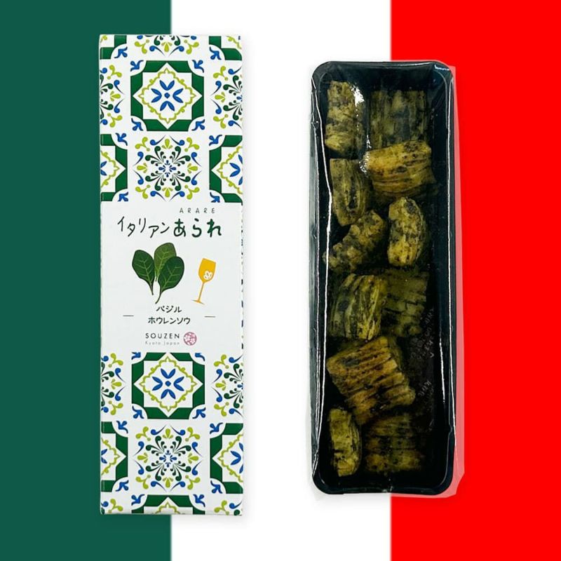 フレッシュなバジルの味わいと絶妙な塩加減の中に、あられの旨味と甘みを感じる和洋織り成す新感覚のあられです。ワインはもちろんですがビールやハイボールにもとてもよく合います。