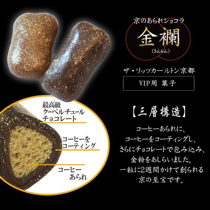 各工程に難関があるうえ、要する時間も長く、まさに丹精込めた品。日本一のカフェチョコあられとして胸を張れるからこそ、高級織物「金襴」の名を付け、一粒一粒に金粉をあしらいました。『親子二代にわたる傑作』をご堪能ください。