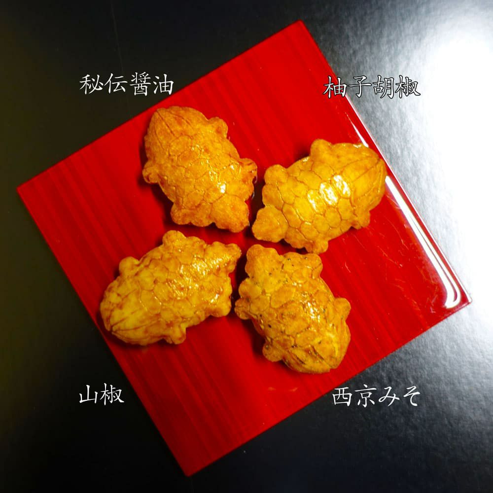 亀の形に膨らむ吉祥のおめでたい餅。この餅1枚を作りだすために、7日間という普通では考えられないほど実に多くの時間と手間をかけ作りあげます。 四方八方にふくらむのが餅、上技(じょうわざ)の技術を用いて自在に操り、ご家庭で簡単に亀の形に「ぷくっ」と膨らむように細工した高度な技法が、一枚一枚に込められております。