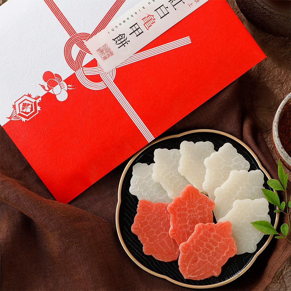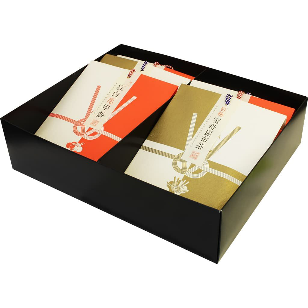 皇室献上品でもある紅白の縁起餅と、宝舟をかたどりました日本一小さな形あるあられを宇治抹茶と合わせた梅昆布茶。ハレの日に相応しいお詰め合わせです。