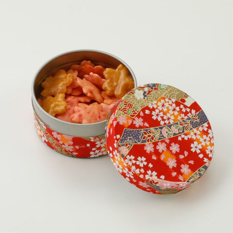 人気の京のあられ・おせんべいから、桜をかたどったしょう油えびあられを、かわいい和柄缶にお詰め致しました。