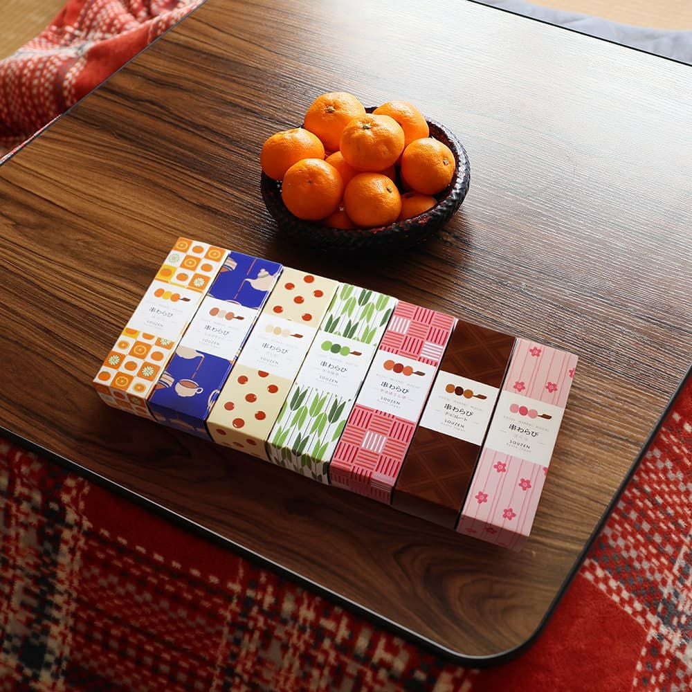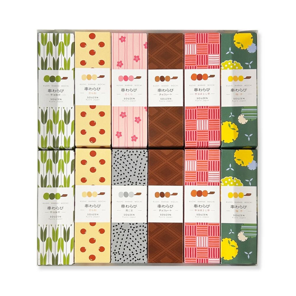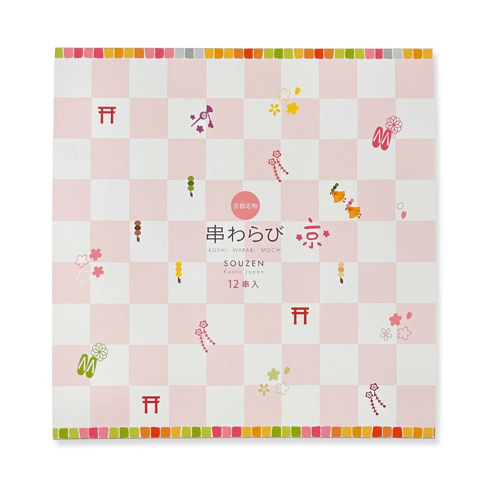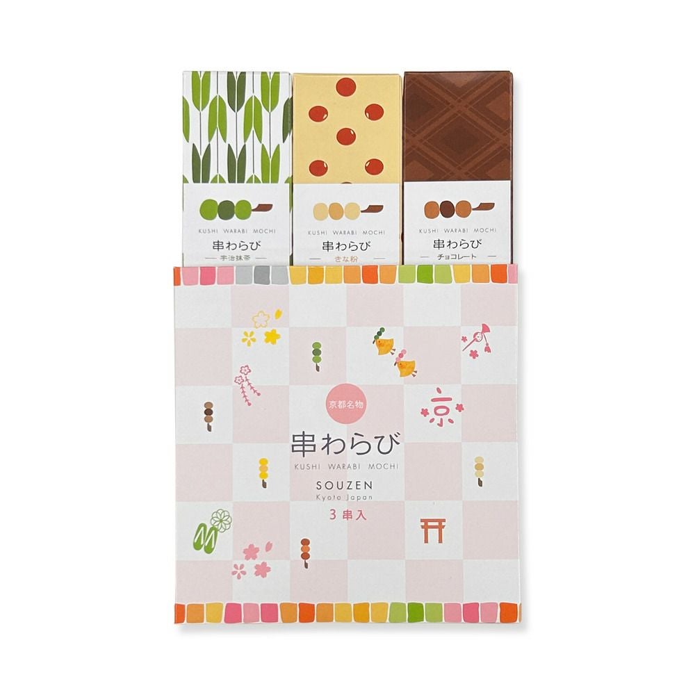 串わらびは、本物の京のわらび餅が串に刺さったスタイルとバラエティ豊かな色と味、可愛らしいパッケージで、京都駅で1日に3,000本売れる大人気商品です。