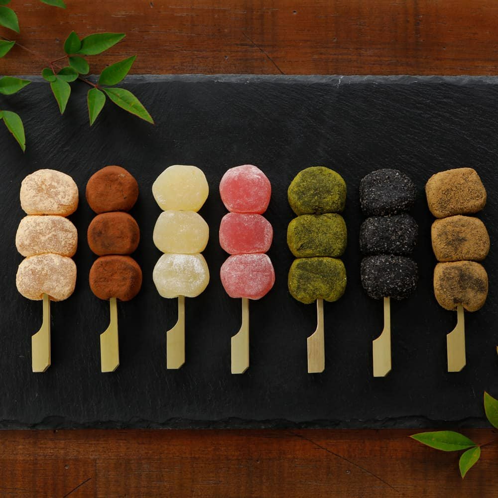 京の新わらび餅「串わらび」のお味は、希少な京都,宇治の茶葉を使用した,宇治抹茶、,宇治ほうじ茶。そして、きな粉、クーベルチュールチョコレート、京都水尾柚子、黒ごま、さくらの7種類を揃えています。