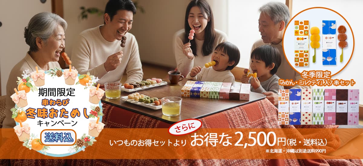 【送料込】冬の味「みかん」「ミルクティ」が入った期間限定セット。いつもの7串セットよりさらにお得なのは今だけ! 串わらび冬限定7串セット