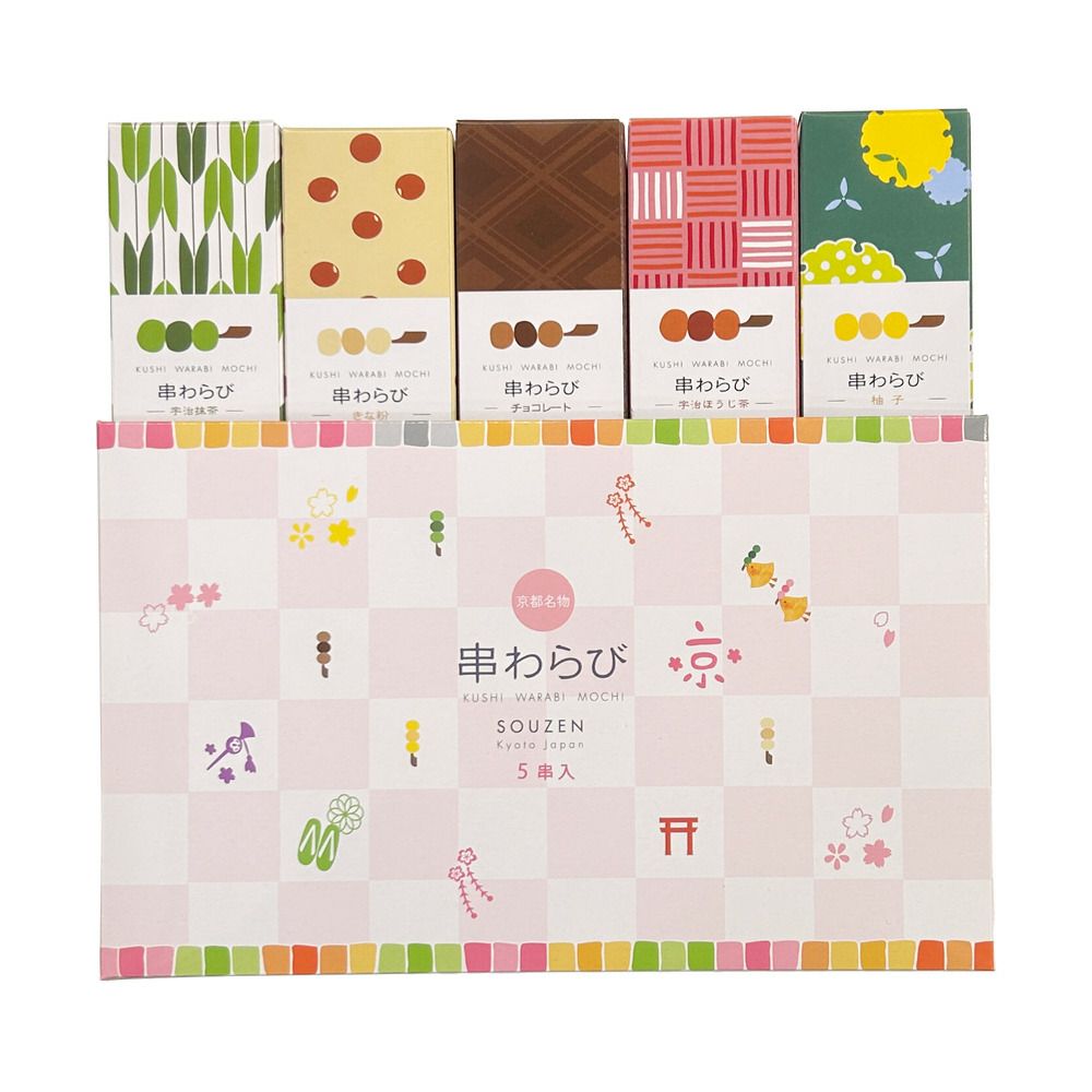 串わらびは、本物の京のわらび餅が串に刺さったスタイルとバラエティ豊かな色と味、可愛らしいパッケージで、京都駅で1日に3,000本売れる大人気商品です。