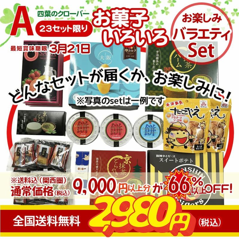 毎月9日は「こわれ久助」を前日8日午後8時から先行ネット販売いたします。そして19日と29日は「四葉のクローバーセット」として7,500円(関西圏送料込)以上のお菓子のバラエティセットを半額以下の2,980円(送料無料:北海道・沖縄は送料半額)でお届けします。
