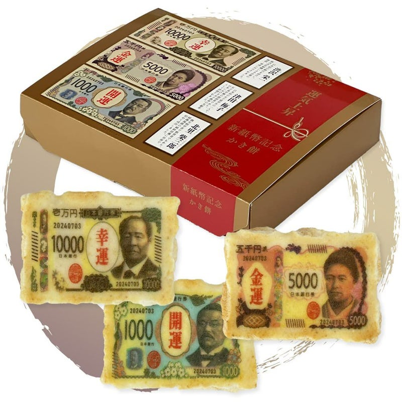 40年ぶりの発行となる新紙幣を記念して、最高級かき餅に新札イメージをプリントした運気上昇、招福開運のおめでたい「縁起物」です。
