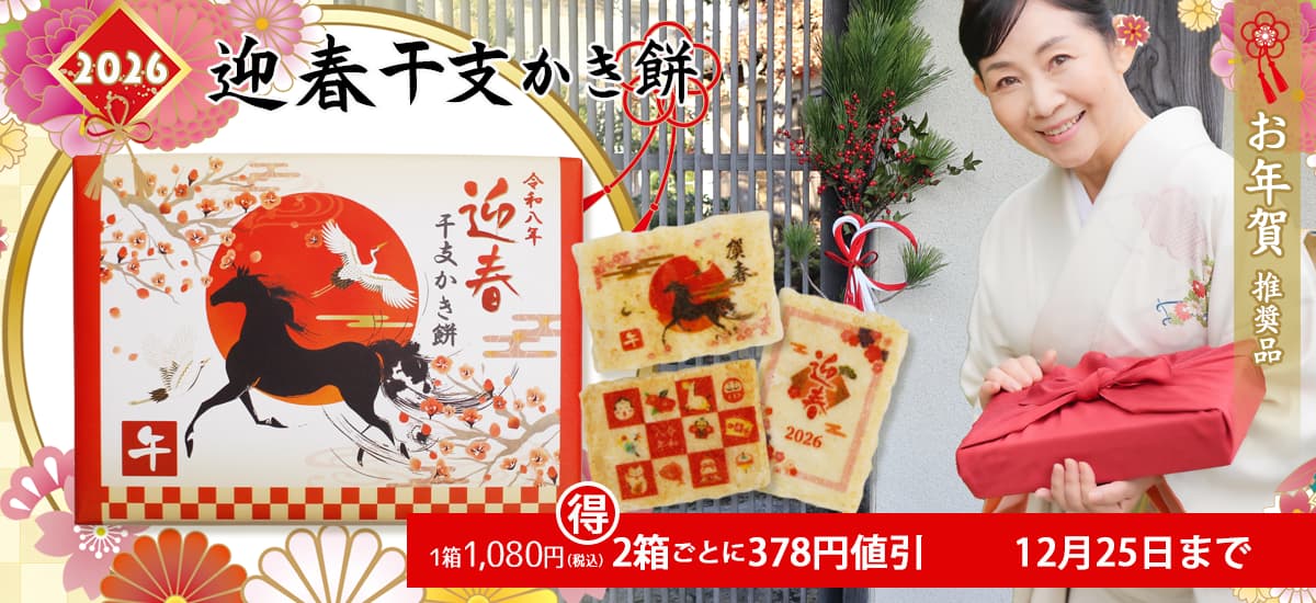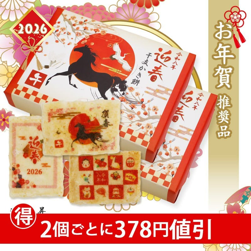 運気を運ぶ「迎春干支かき餅」に「2026年迎春絵柄」を入れた特別セットの縁起ものです。新年を祝う言葉に添えてのお年賀にどうぞご利用ください。おまとめ買い2個ごとに378円お値引き。