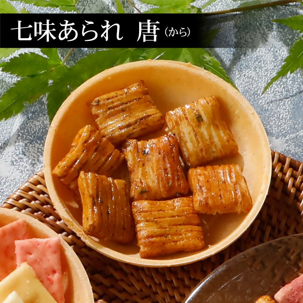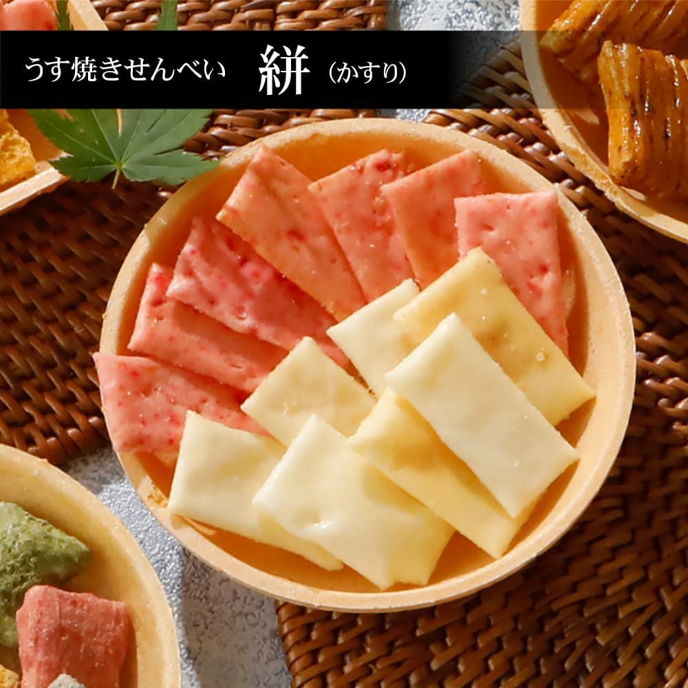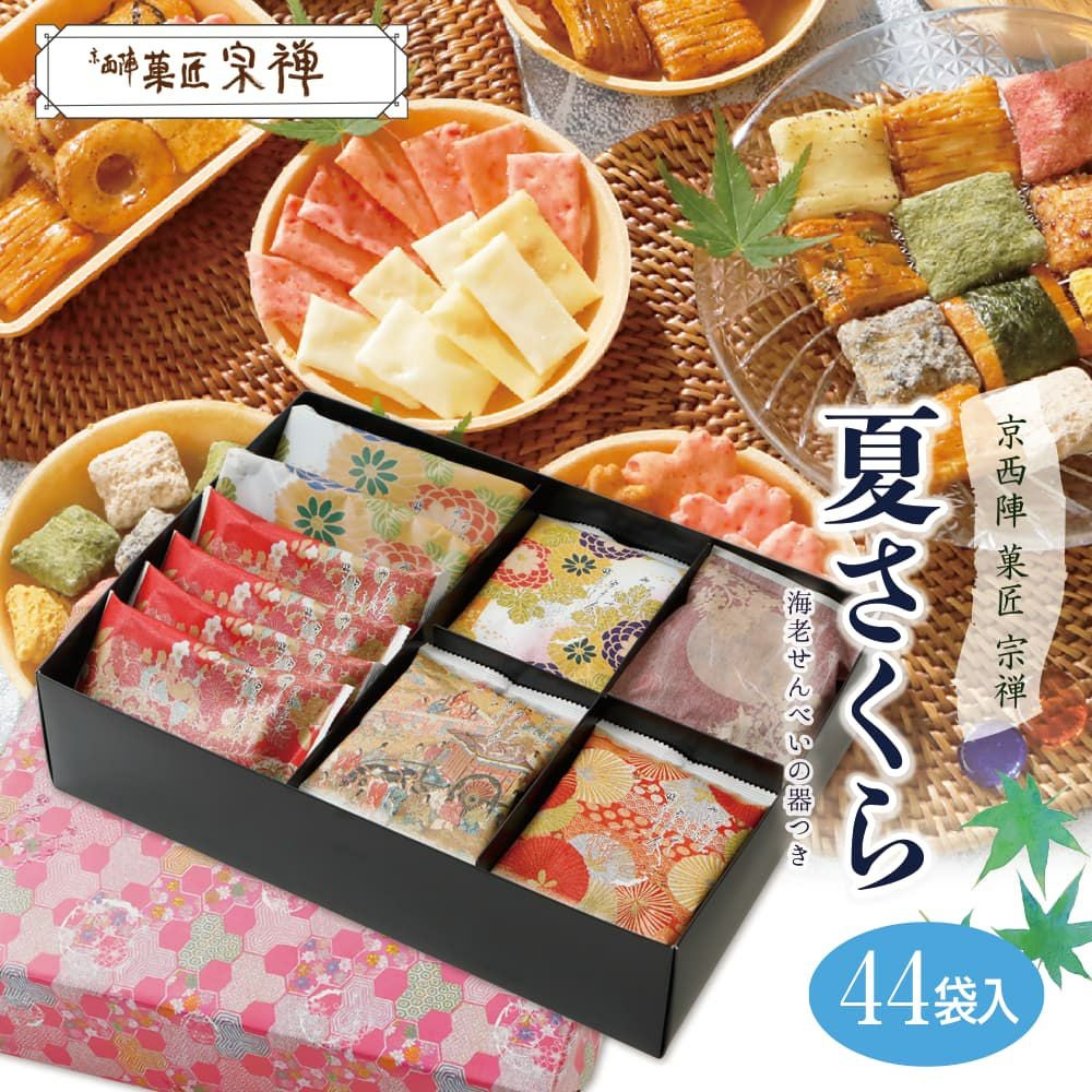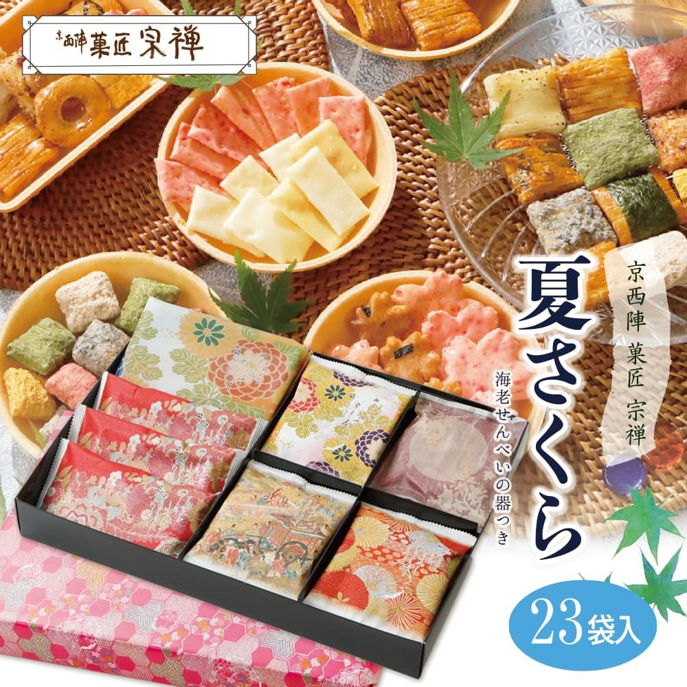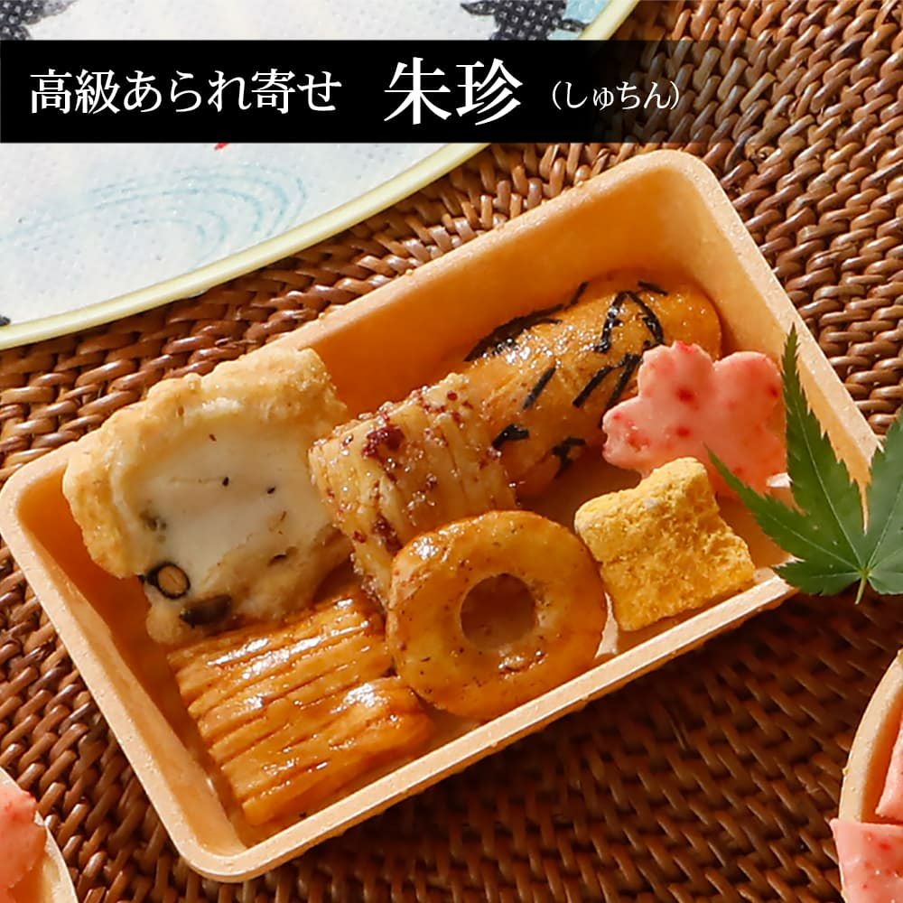 食べられるえび煎餅の器に7種の京のあられを集めた「朱珍」オリジナル「夏絵柄塩せんべい」「薄焼きせんべい(絣)」「桜あられ(緞子)」「和三盆五色あられ(繻子)」と、12種の味が楽しめる「暦あられ綴」を加えた夏限定セットです。手にした方がどなたも目を見張るボリューム感あるご贈答品です。