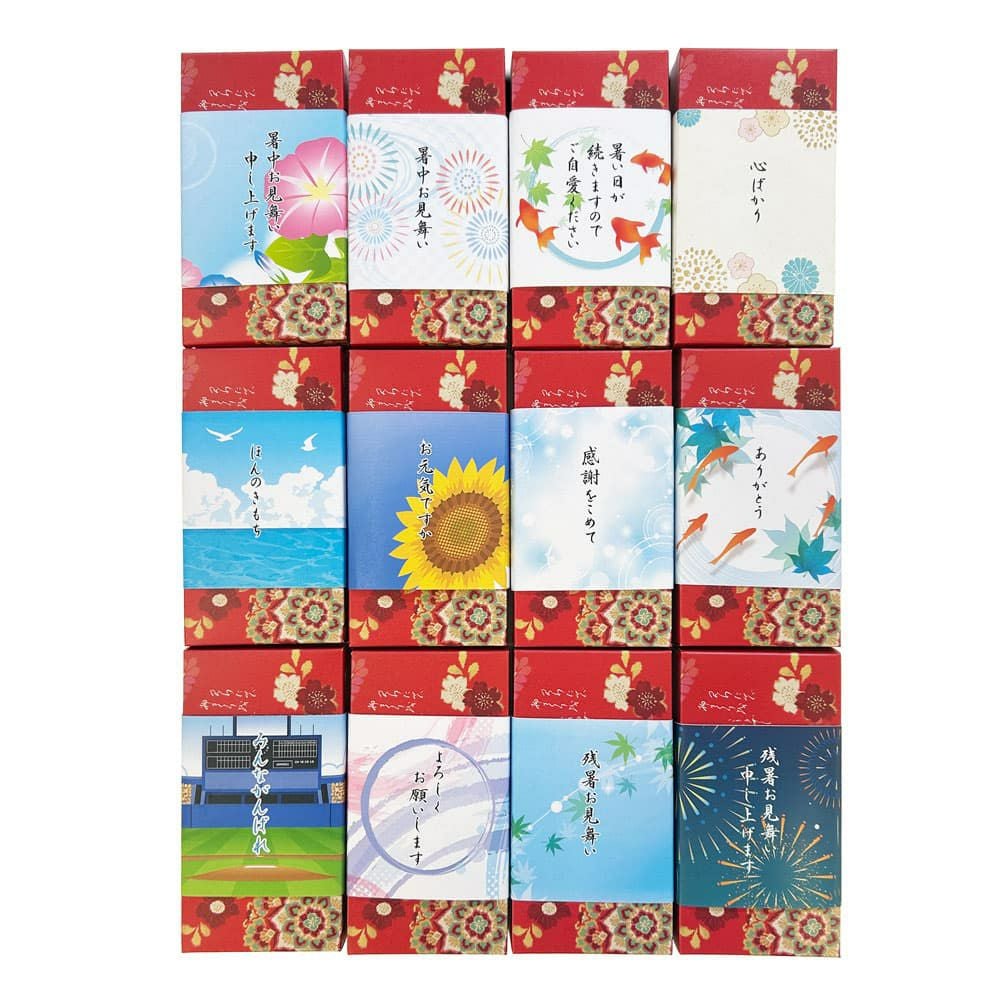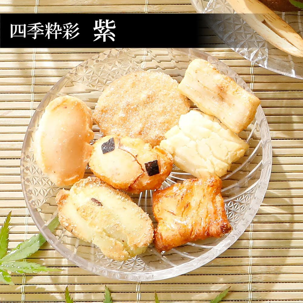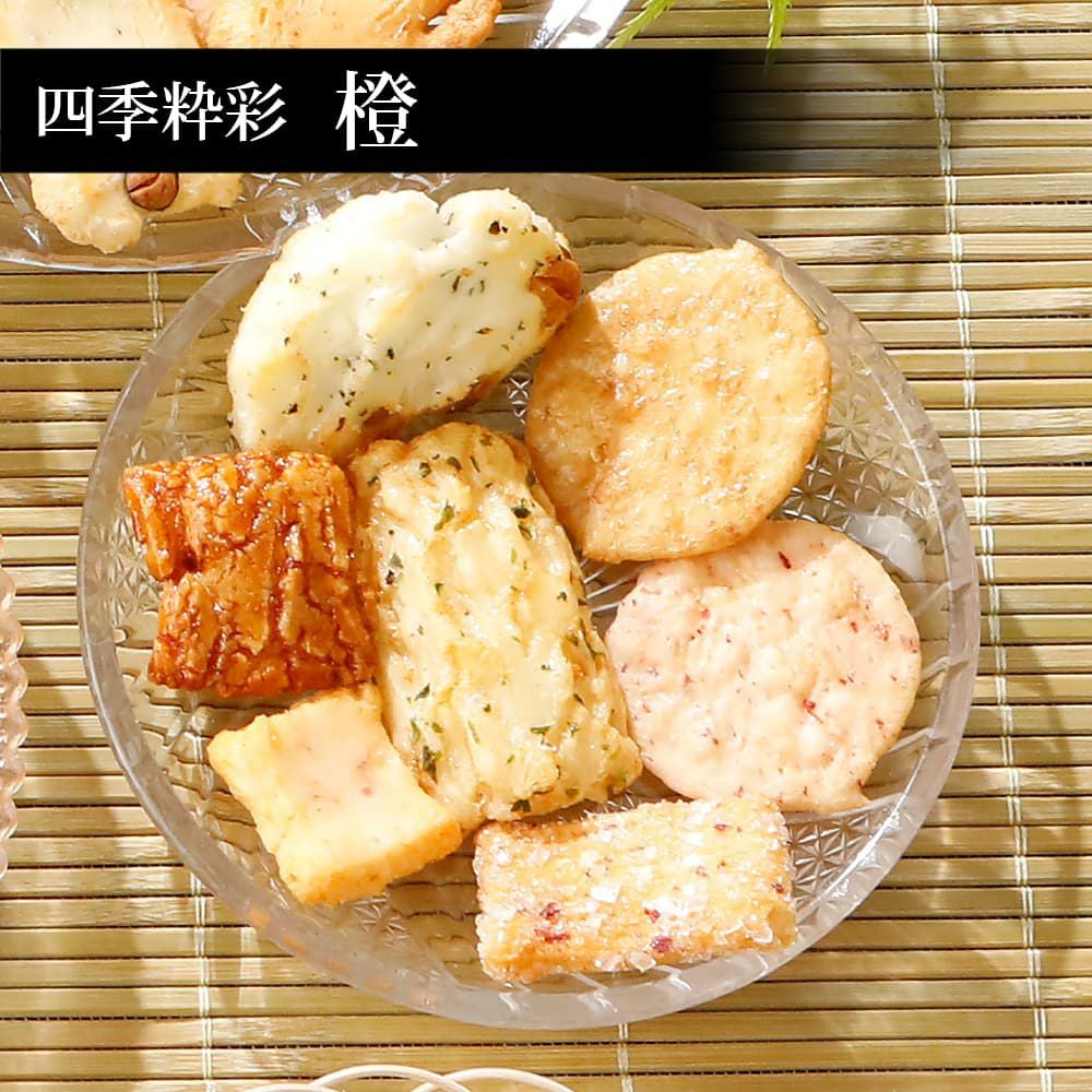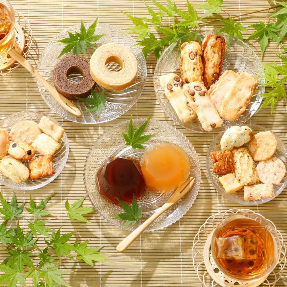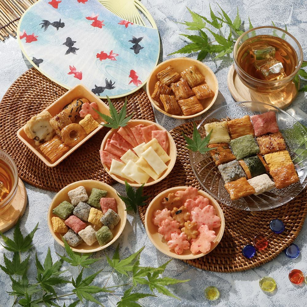 食べられるえび煎餅の器に7種の京のあられを集めた「朱珍」オリジナル「夏絵柄塩せんべい」「薄焼きせんべい(絣)」「桜あられ(緞子)」「和三盆五色あられ(繻子)」と、12種の味が楽しめる「暦あられ綴」を加えた夏限定セットです。手にした方がどなたも目を見張るボリューム感あるご贈答品です。