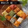 餅米(国産)、和三盆糖、うるち米(国内産)、小麦粉、植物油脂、たまり醤油、砂糖、じゃがいも澱粉、コーンスターチ、えび粉、黒胡麻、マヨネーズ(食用植物油脂、卵黄、醸造酢、その他)、食塩、黒豆、調合醤油(たまり醤油、蛋白加水分解物、水飴)、梅肉、醤油、植物油、調味塩、きな粉、白エビ(えび(オキアミ)、食塩)、赤エビ(えび(オキアミ)、食塩)、澱粉分解物、抹茶、味醂、海苔、昆布エキス、バター、柚子皮、蛋白加水分解物、鰹節エキス、粉末醤油(食塩、白醤油、たん白加水分解物、その他)、えび、味噌、クロレラ、ねぎ、柚子粉、明太子風味調味料、七味唐辛子、昆布粉末、かつおエキスパウダー、黒胡椒、明太子加工品、酵母エキス、四味(チンピ、唐辛子、胡麻、その他)、唐辛子、ニッキ/加工デンプン、増粘剤(加工デンプン)、トレハロース、調味料(アミノ酸等)、着色料(クチナシ色素、パプリカ色素、紅麹色素、カラメル色素、赤102、青1、黄4、赤106)、アルコール、乳化剤、酸化防止剤(V.E、チャ抽出物、V.C)、膨張剤、pH調整剤、甘味料(甘草、アセスルファムカリウム、ステビア)、香辛料抽出物、リン酸三Ca、(一部にえび・小麦・卵・乳成分・ごま・さば・大豆・鶏肉・豚肉・りんごを含む)