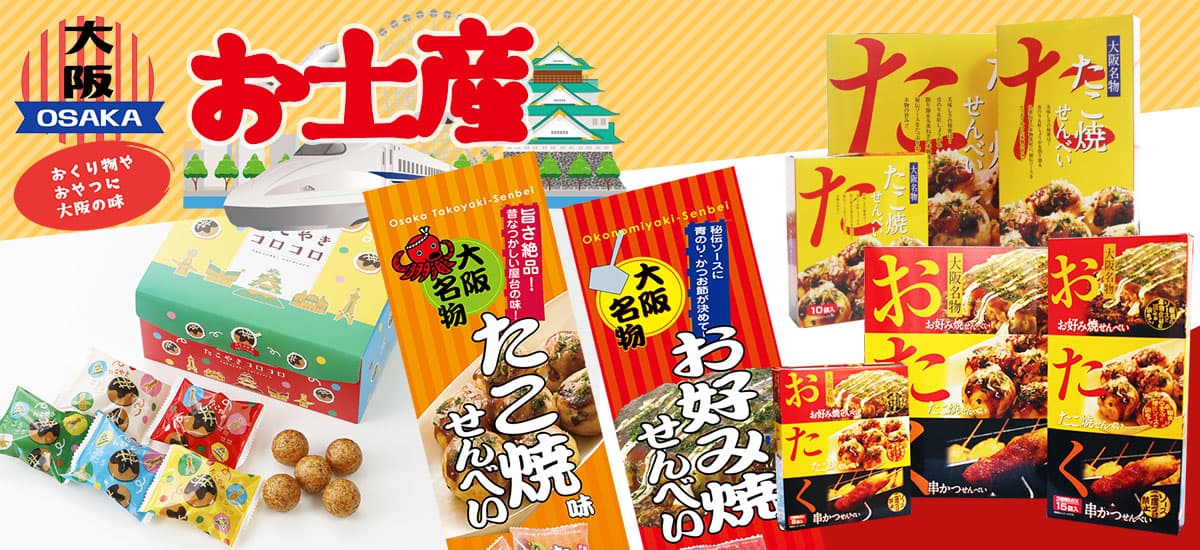 人気の大阪土産なら創業74年の長寿堂恵佳のお土産菓子!たこ焼きせんべいNo.1の 大阪名物たこべえをはじめ、お好み焼きせんべい、串かつせんべい、カワイイたこやきスナックなど大阪駅、新大阪駅、伊丹空港、関西空港で大人気の大阪土産を通販でお取り寄せ!