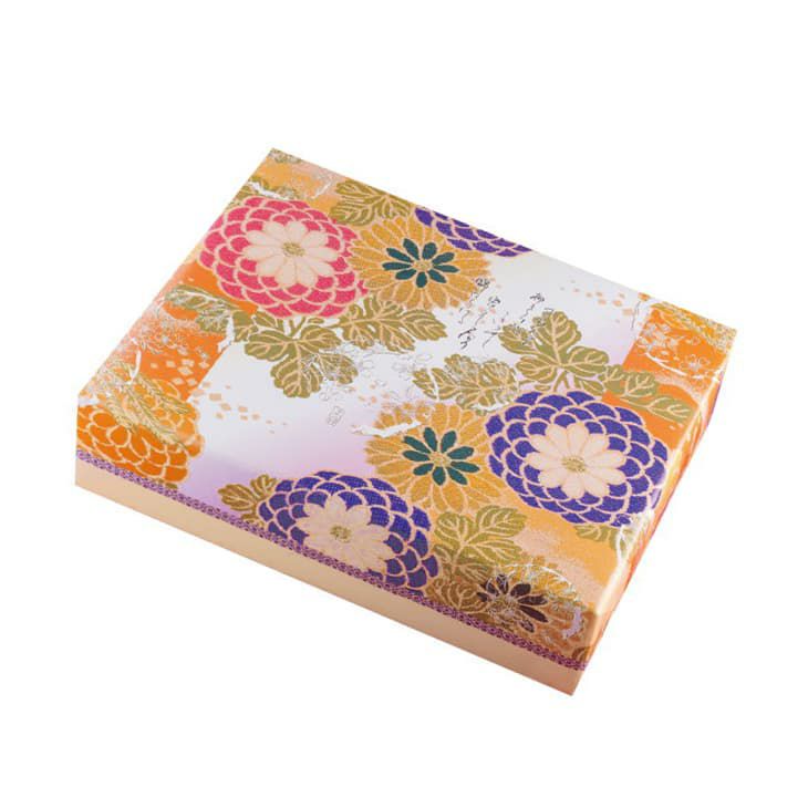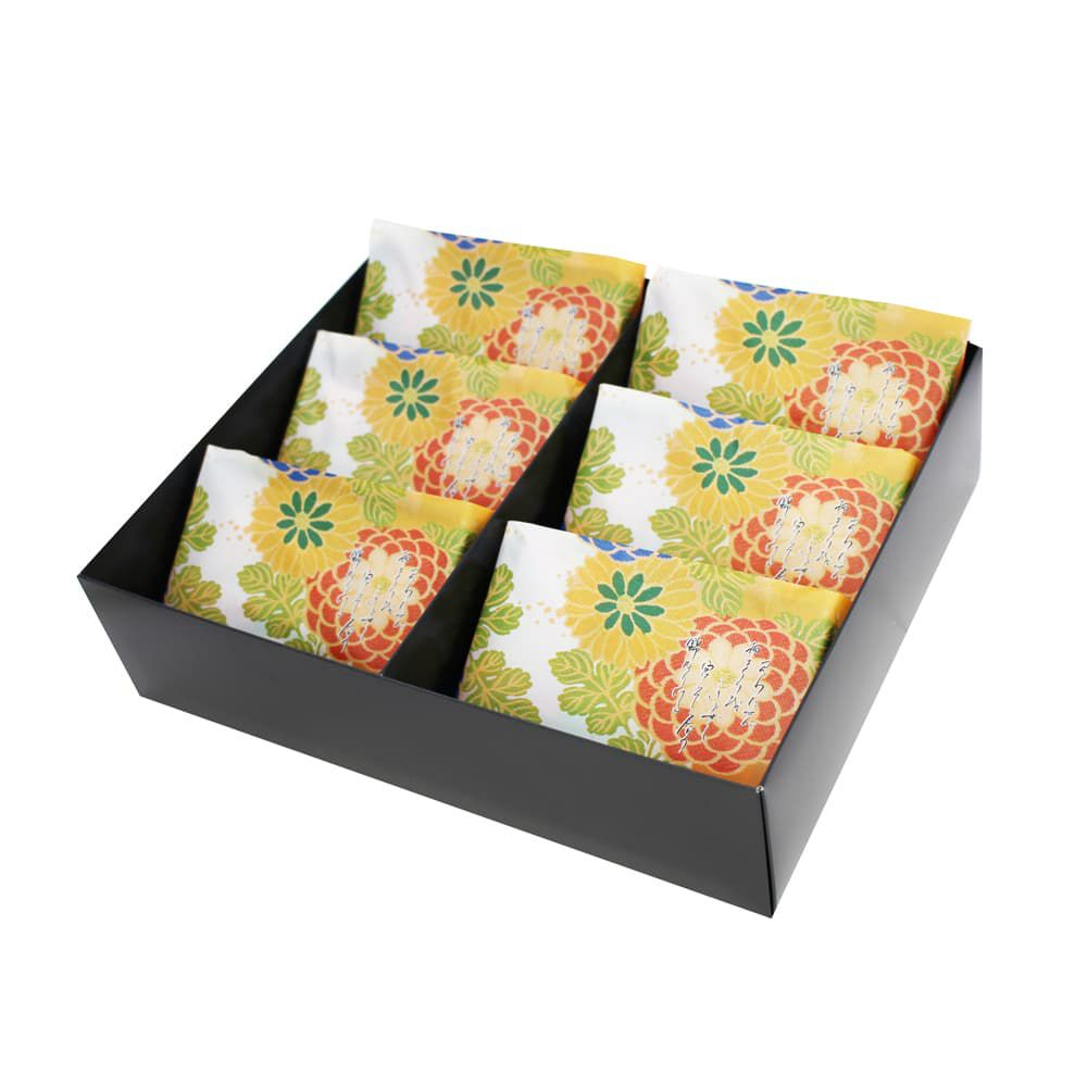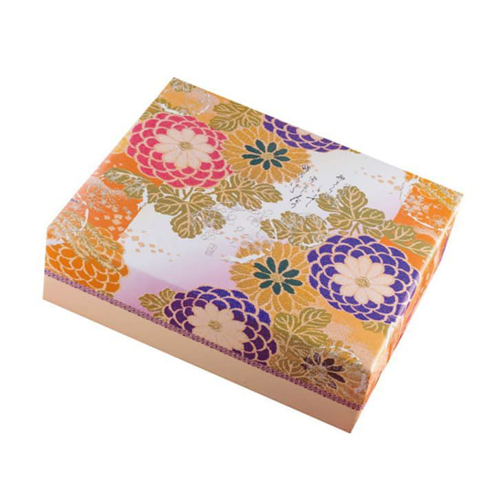 宇治抹茶、南高梅を用いた和三盆とざらめ、京七味、柚子、明太子、黒胡椒、九条ねぎに西京味噌、黒胡麻、秘伝しょうゆ、きな粉、焼海苔。これらこだわりの素材を用いて創りあげた京のあられにて、四季折々に美しく移り変わりゆく京の十二ヶ月を表現致しております。