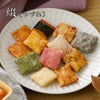餅米(国産)、和三盆糖、小麦粉、たまり醤油、じゃがいも澱粉、砂糖、コーンスターチ、醤油、えび粉、黒胡麻、植物油脂、マヨネーズ(食用植物油脂、卵黄、醸造酢、その他)、食塩、梅肉、調合醤油、黒豆、味醂、きな粉、澱粉分解物、抹茶、調味塩、海苔、植物油、味噌、澱粉、白エビ(えび(オキアミ)、食塩)、赤エビ(えび(オキアミ)、食塩)、バター、ねぎ、桜海老、柚子粉、蛋白加水分解物、昆布エキス、柚子皮、明太子風味調味料、クロレラ、鰹節エキス、粉末醤油(食塩、白醤油、たん白加水分解物、その他)、明太子加工品、柚子胡椒(青柚子果皮、青唐辛子、食塩、酒精)、糖類(砂糖、ぶどう糖)、黒胡椒、七味唐辛子、えび、酵母エキス、四味(チンピ、唐辛子、胡麻、その他)、ニッキ、唐辛子/加工デンプン、調味料(アミノ酸等)、着色料(クチナシ色素、パプリカ色素、紅麹色素、赤102、カラメル色素)、アルコール、膨張剤、乳化剤、酸化防止剤(V.E、V.C)、pH調整剤、甘味料(甘草、アセスルファムカリウム、ステビア)、香辛料抽出物、リン酸三Ca、(一部にえび・小麦・卵・乳成分・ごま・さば・大豆・鶏肉・豚肉・りんごを含む)