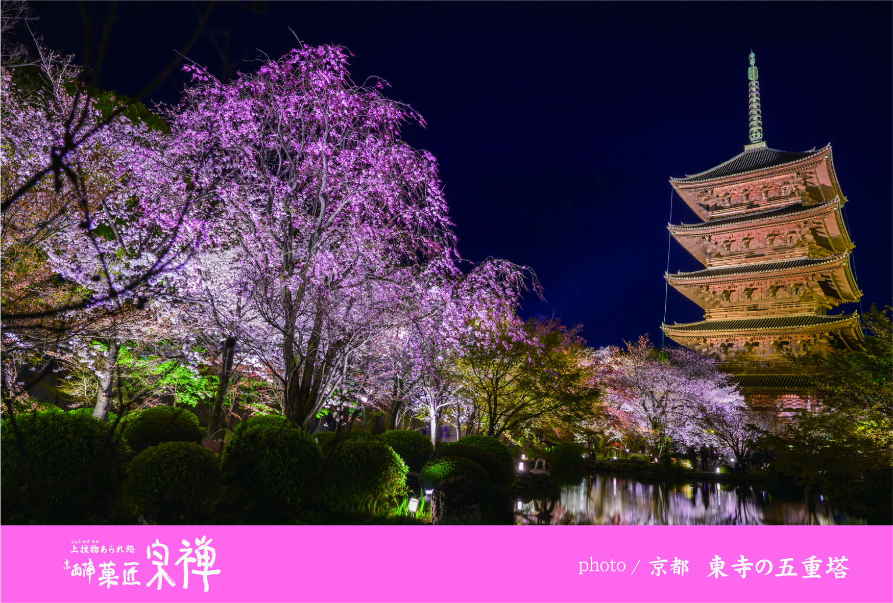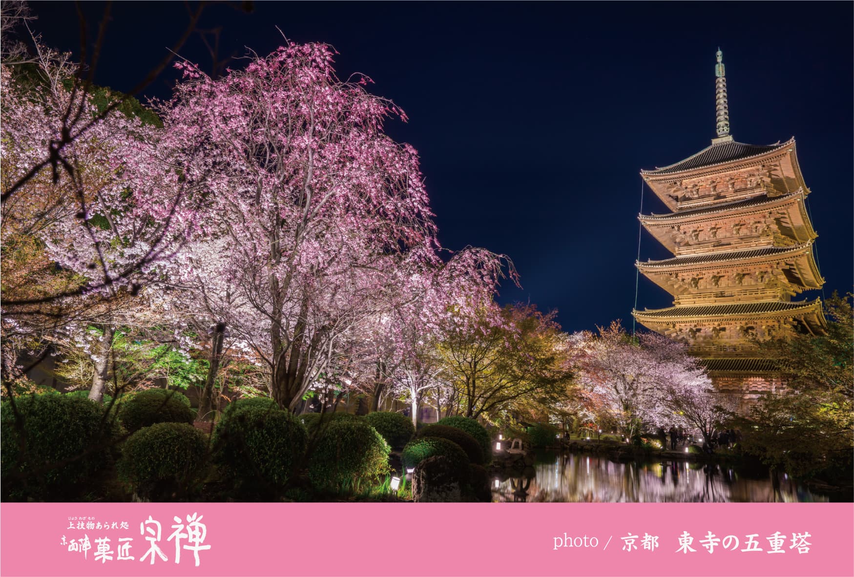 期間中は東寺の桜がライトアップされ、昼間とはまた違う、幽玄な桜の表情を楽しめます。五重塔と桜が、リフレインする池の光景も幻想的です。