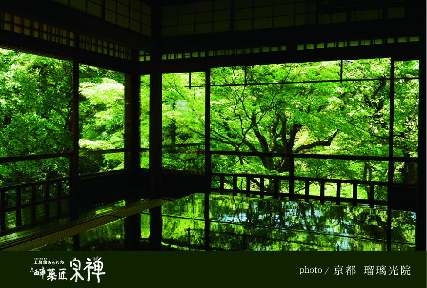 るりこういんのあおもみじ比叡山の麓にある浄土真宗の寺院。通常非公開だが、春の青もみじと秋の紅葉の時期にだけ公開される(夏の特別拝観が催されることもあります)。数寄屋造りの書院は、大正時代の終わり頃から昭和初期にかけて、京数寄屋造りの名人と称される中村外二によって造営されたもの。書院前には佐野藤右衛門一門の作庭と伝わる「瑠璃の庭」があり、「瑠璃色に輝く」と表現されるほど苔の絨毯が美しい。また庭園の紅葉が書院の机や床に映り込む様子も絶景。境内には、三条実美命名の由緒ある茶庵「喜鶴亭(きかくてい)」や、八瀬名物「かま風呂」の見学もできる。