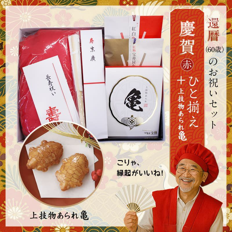 他の画像を見る ちゃんちゃんこ一式(フリーサイズ)と健康長寿を祈願した縁起餅・よろ昆布茶+上技物あられのグレードアッププラン 【賀寿】<グレードアッププラン>ひと揃え11点 販売価格 ¥ 7,888 税込 詳細を見る お気に入りに登録する